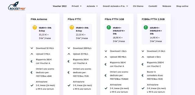- Fibra FTTH 2.5GB (Voucher C): 14,90 euro al mese (IVA esclusa), 5 euro al mese per 24 mesi il costo di attivazione, download fino a 2,5 Gbps e router in comodato d’uso Fritz!Box 5530. In virtù del voucher C il risparmio assicurato è di 2.500 euro