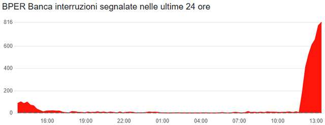 Si sono moltiplicate rapidamente le segnalazioni relative a un down per i servizi online di BPER Banca. Come sempre, i feedback sono raccolti dal portale Downdetector. I primi riscontri sono comparsi intorno a mezzogiorno, fino a raggiungere il picco un’ora e mezza più tardi.