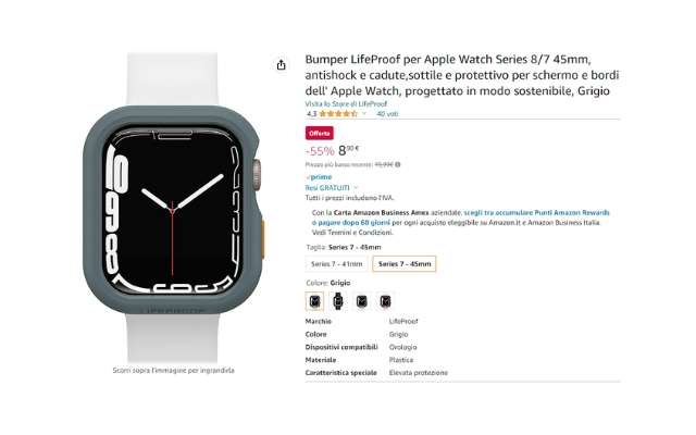 Non rischiare di rompere il tuo Apple Watch Series 7 o Series 8, ma proteggilo ogni momento con il Bumper LifeProof. Oggi su Amazon lo acquisti al 55% di sconto. Mettilo subito in carrello a soli 8,90 euro, invece di 19,99 euro. Si tratta di un’ottima occasione per mettere al sicuro il tuo WatchOS. Ogni giorno al polso è sempre a rischio urti e cadute. Perciò è necessaria questa protezione di altissima qualità.