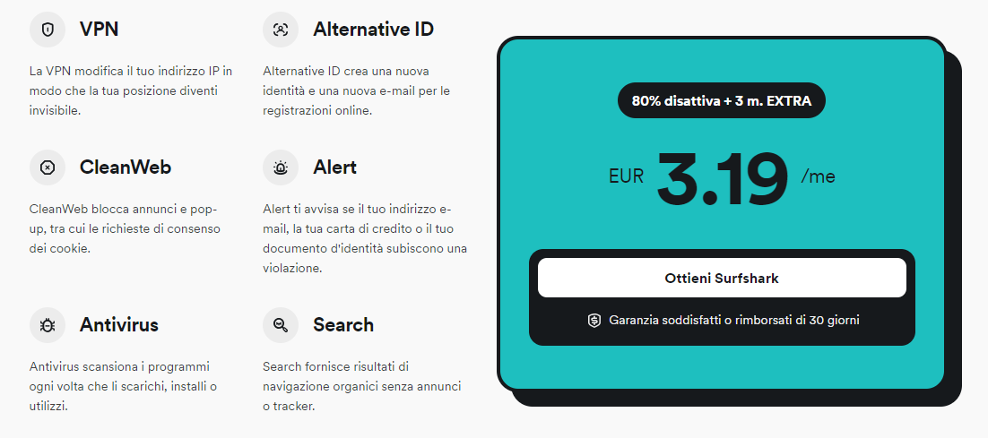 La rete offre tante opportunità, ma ci sono anche numerose minacce. Per fortuna, c’è un bundle di sicurezza che mette a posto le cose: Surfshark One. Questo strumento qualitativamente superiore, disponibile a 3 euro al mese, è la tua arma segreta per difendere privacy e sicurezza online.