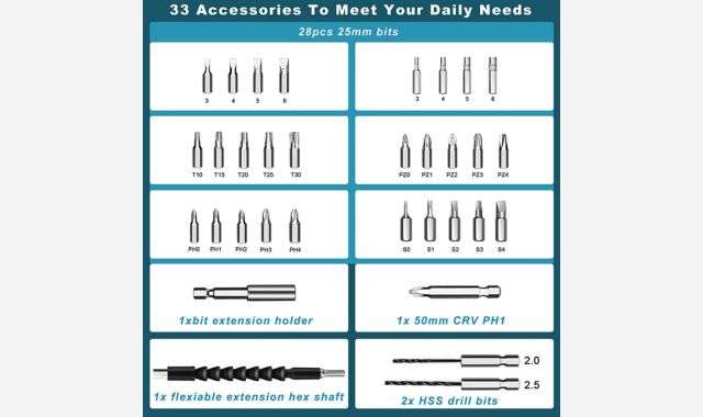La confezione include un set di 28 punte magnetiche e un portapunte. Le punte magnetiche facilitano il recupero e impediscono la caduta delle viti. Inoltre, il set comprende due punte per trapano e una cremagliera per punte da trapano, perfette per lavori di foratura precisi e per lavorare in spazi ristretti. Con il cacciavite Kiprim, avrai tutto ciò di cui hai bisogno per portare a termine ogni progetto con facilità.