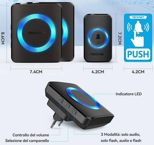 È operativo fino a 400 metri di distanza e già questo è un vantaggio degno di nota. La componente esterna può contare sulla certificazione IP65 che ne garantisce l’impermeabilità e la resistenza agli agenti atmosferici. Come si legge nella scheda del prodotto, è perfetto anche per chi ha problemi di udito, grazie alla possibilità di impostare un volume molto alto (fino a 110 dB). Inoltre, è presente un LED blu lampeggiante che si illumina quando qualcuno suona.