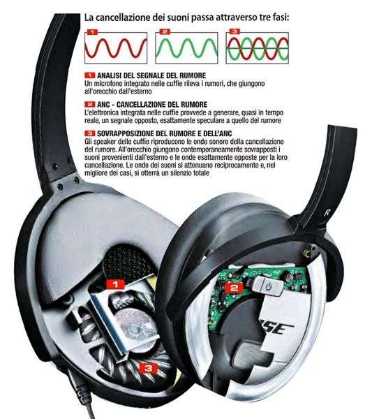 Nel primo caso, la soluzione si ottiene innalzando pareti insonorizzate, installando finestre con doppi vetri o indossando i vecchi e sempre validi tappi per orecchie. Il secondo metodo consiste nell’eliminare il rumore ricorrendo a una cancellazione attiva, Active Noise Cancelling (ANC), o ad una sua riduzione tramite la tecnologia Active Noise Reduction (ANR). Le tecnologie ANC o ANR non sono altro che un metodo per ridurre il suono non voluto, tramite la sovrapposizione di un secondo suono, specificatamente progettato per cancellare il primo. Il principio di funzionamento è di una semplicità sbalorditiva: un microfono rileva i suoni dell’ambiente, mentre un processore genera un segnale acustico inverso, perfettamente identico ma opposto, che viene poi riprodotto dagli speaker. Nel caso ideale, i due segnali acustici si sovrappongono generando così un silenzio assoluto.