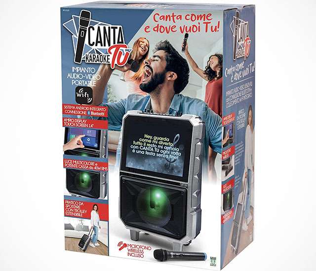 La nuova versione del Canta Tu Karaoke originale è un impianto audio-video completo e portatile, con schermo touch da 14 pollici, una potente cassa da 40 W, porta USB, connettività Bluetooth e giochi di luce. Insomma, una rivisitazione hi-tech di un classico del catalogo Giochi Preziosi, oggi proposta in sconto di 50 euro su Amazon. Il cuore è però lo stesso di sempre: basi musicali e testi per dare sfoggio alle proprie abilità canore.