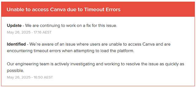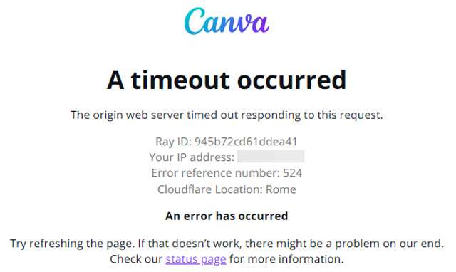 Siamo a conoscenza di un problema per cui gli utenti non riescono ad accedere a Canva e riscontrano errori di timeout quando tentano di caricare la piattaforma.