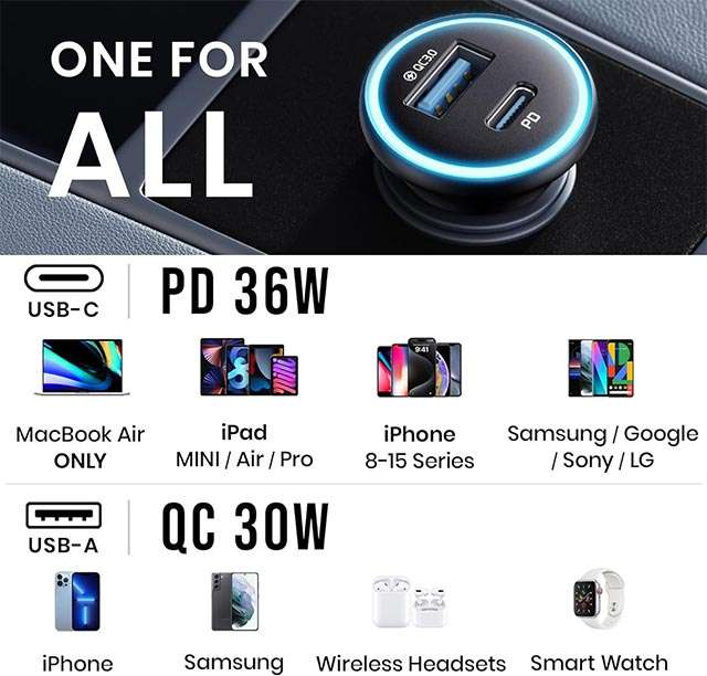È dotato di due porte, una USB-A e l’altra USB-C, basate rispettivamente sulle tecnologie Quick Charge 3.0 e Power Delivery 3.0. Possono erogare 30 W e 36 W, anche contemporaneamente, alimentando così due diversi dispositivi, ad esempio lo smartphone e un tablet oppure il navigatore, persino un notebook se necessario. Tra gli altri punti di forza segnaliamo la presenza di una luce LED non invadente e del corpo resistente realizzato in lega di alluminio. Per altre informazioni, dai uno sguardo alla descrizione completa.