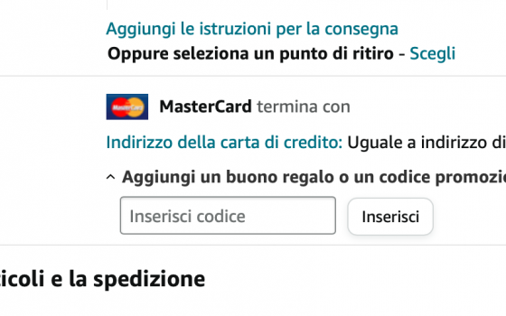 Per farlo dovrai quindi aggiungere il prodotto nel carrello, scegliere l’indirizzo di spedizione e, digitare il codice ricevuto per email nel campo di testo “Aggiungi un buono regalo o un codice promozionale” sotto la sezione dedicata al pagamento. Qualora disponessi di più codici, potrai inviarli in successione uno per volta. La somma complessiva verrà poi scalata dall’ordine. Ora dovrai soltanto concludere l’acquisto in maniera standard.