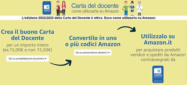 Anche quest’anno, Amazon rinnova il proprio impegno a supporto della Carta del Docente, l’iniziativa messa in campo fin dal 2016 dal Ministero in favore di chi insegna. L’e-commerce permette di convertire il contributo (o una parte di esso) in credito da spendere sul proprio store online, all’interno di determinate categorie. Tutti i dettagli sono illustrati nella sezione dedicata, riassumiamo qui la procedura da seguire.