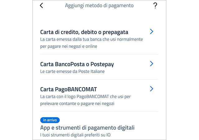 Aprendo IO, entrando nella sezione Portafoglio e provando ad aggiungere un metodo di pagamento, la voce “App e strumenti digitali” risulta però al momento etichettata come “in arrivo”.