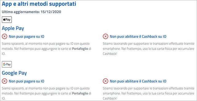 Ad oggi il portale ufficiale di IO non riporta i due metodi di pagamento come supportati, ma l’ultimo update risale al 15 dicembre 2020.