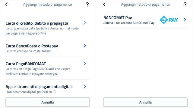 - Bancomat PAY: non si può pagare su IO, si può partecipare al Cashback;