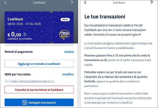 Nella scheda dell’app IO relativa al Cashback continua a comparire € 0,00 come rimborso accumulato, ma non c’è da preoccuparsi: è sufficiente premere “Dettaglio transazioni” per sapere che “Possono passare fino a 72 ore prima che tu veda la transazione su IO, anche se di solito il processo è più rapido”. La schermata avvisa inoltre che “Potrebbe volerci un po’ di più nel caso in cui l’acquisto sia a ridosso del weekend o di qualche festività, oppure in qualche altra condizione particolare”.