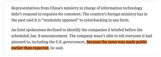 Secondo quanto diffuso dal Wall Street Journal , Intel avrebbe preavvisato alcune grandi aziende cinesi del mondo della tecnologia con anticipo rispetto alla conferma pubblica. Tra queste vi sarebbero state Lenovo e Alibaba. Intel avrebbe invece tenuto all’oscuro le rivali statunitensi procrastinando il silenzio . Nel mentre le aziende coinvolte hanno però negato di aver condiviso dati con il Governo. Nessuno al momento però potrebbe escludere che l’intelligence cinese abbia approfittato della situazione per garantirsi dei vantaggi competitivi di vario genere.