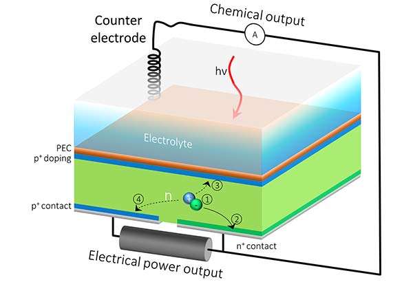 Le celle di questo tipo più tradizionali sono composte da una serie di livelli in grado ognuno di assorbire diverse lunghezze d’onda della luce, generando in output un voltaggio impiegato poi per dividere l’acqua in O e H. Ciò che ha fatto il team di ricercatori è stato aggiungere un secondo contatto elettrico sulla superficie posteriore, quella solitamente dedicata alla raccolta dell’energia prodotta, così da dividerla in due parti, una da destinare al processo di fotosintesi artificiale e l’altra che può essere convogliata all’interno delle batterie di storage oppure immessa in rete.