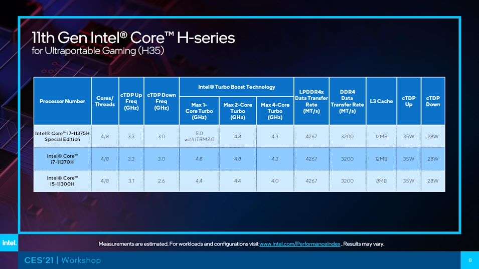 Storicamente Intel ha sempre suddiviso i processori mobile in due categorie: serie U con TDP massimo di 15 Watt e serie H con TDP massimo di 45 Watt. La nuova architettura Tiger Lake ha permesso di incrementare il TDP della serie U fino a 35 Watt, ma invece di utilizzare il suffisso U35, Intel ha scelto il suffisso H35 (creando un po’ di confusione, ndr).