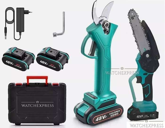 Acquistando il kit potatura con cesoia a forbice e mini motosega elettrica con l’offerta su eBay a 45€, riceverai anche la valigetta per il trasporto, il caricabatterie e altri preziosi accessori per la cura del tuo giardino.