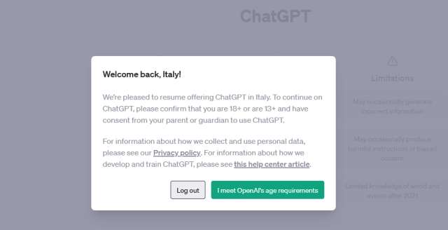 - ha introdotto una schermata di benvenuto alla riattivazione di ChatGPT in Italia, con i rimandi alla nuova informativa sulla privacy e alle modalità di trattamento dei dati personali per il training degli algoritmi;