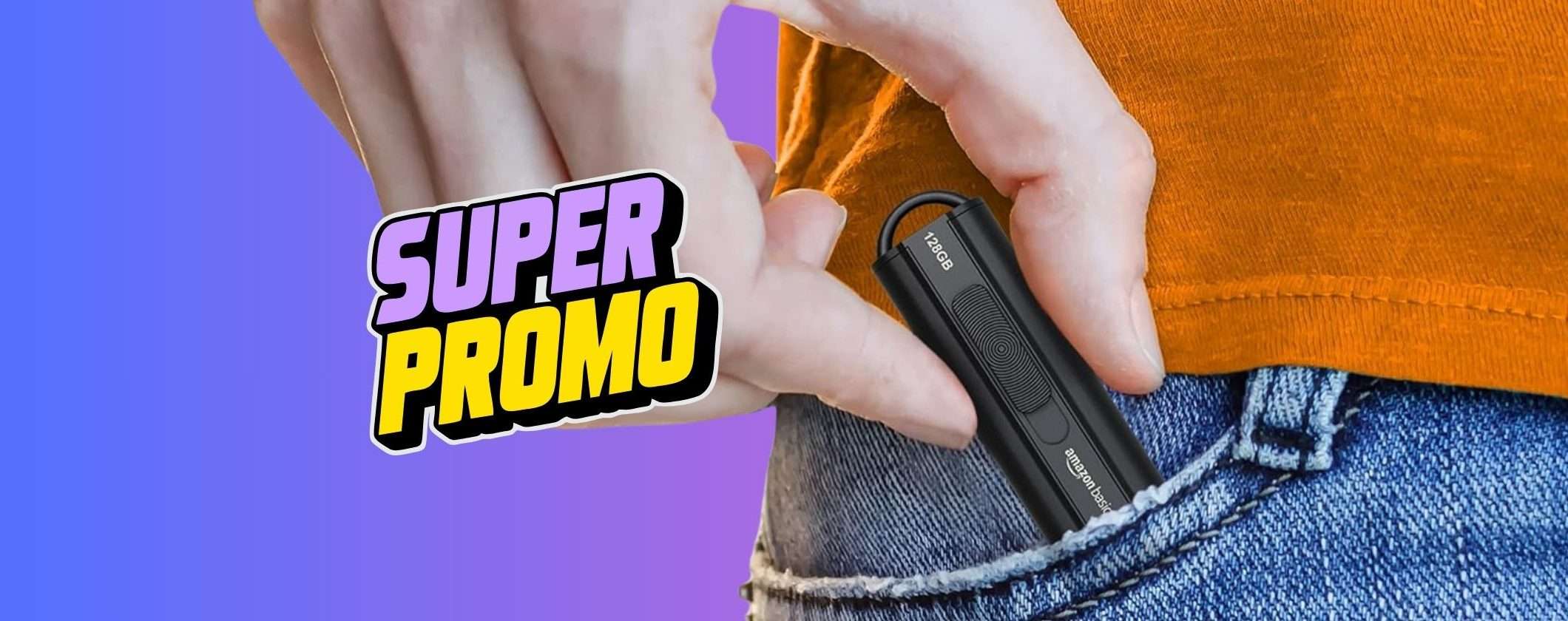 Ottenere spazio di archiviazione extra e portatile oggi è facile e sicuro grazie alla Chiavetta USB 128GB Amazon Basic. Oggi è in offerta su Amazon! Acquistala ora a soli 22,27 euro! Si tratta di una promozione decisamente conveniente vista la qualità di questo prodotto. Il connettore si nasconde all’interno della scocca e lo estrai solo al bisogno, quando devi collegarla al tuo dispositivo.