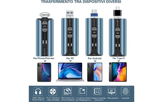 La Chiavetta USB 4 in 1 è uno di quegli oggetti che non deve mai mancare. Pratica e utilissima, ti permetterà di trasferire dati da un dispositivo all’altro con estrema facilità, perché universale, e anche con tanta velocità. La sua tecnologia 3.0 ti assicura velocità in lettura di 80 MB/s e in scrittura di 40 MB/s. Inoltre potrai proteggere i tuoi dati con password o Touch ID.