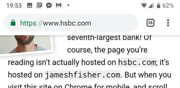 La tecnica descritta potrebbe essere messa in atto, ad esempio, per portare a termine un attacco di phishing, facendo credere al malcapitato di trovarsi su un sito autorevole mentre ne visita uno completamente di altra natura, così da indurlo a digitare informazioni personali, credenziali di login o dati relativi ai metodi di pagamento. Con poche linee di codice è infatti possibile mostrare una barra dell’indirizzo fasulla, con tanto di contatore delle schede aperte e pulsante per l’attivazione del menu, che si aggancia al bordo superiore dello schermo non appena si inizia a effettuare lo scrolling, senza più dar possibilità di tornare a vedere quella autentica, nemmeno risalendo in cima alla pagina. Il risultato è quello visibile nello screenshot allegato di seguito: pur trovandosi su jameshfisher.com, si legge hsbc.com, dominio appartenente a uno dei più importanti gruppi bancari al mondo.