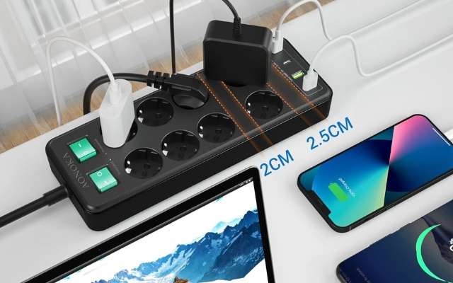 Scegli questa Ciabatta 8 Prese Shuko dotata di due interruttori. Solida e sicura, è un prodotto di altissima qualità. Le sue dimensioni compatte sono state pensate per salvare spazio sulla scrivania senza rinunciare a diverse prese per collegare i propri dispositivi. Questa ciabatta è anche dotata di 2 porte USB-A e 2 porte USB-C per una ricarica velocissima dei tuoi device.