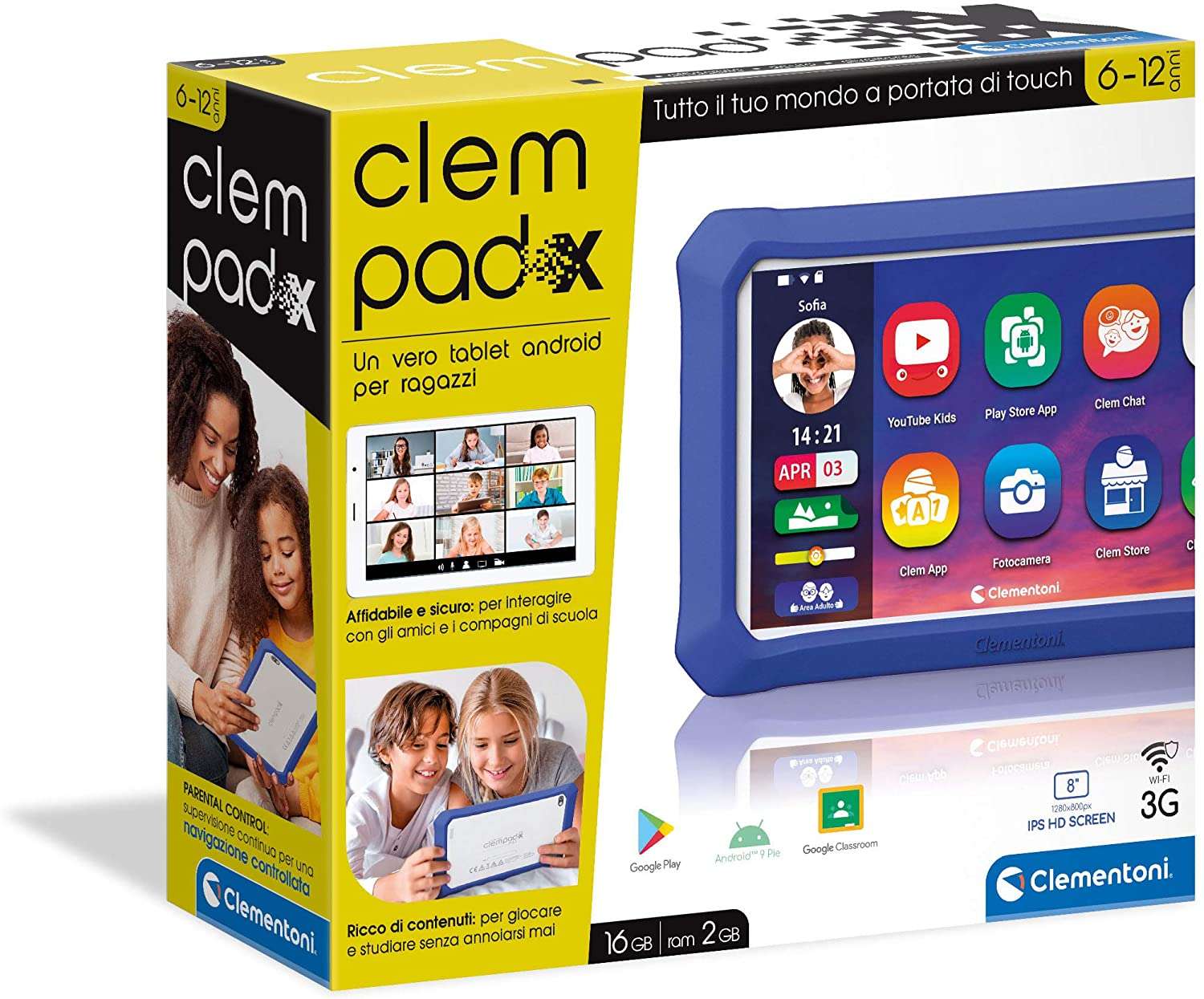 Il ClemPad X è un tablet con schermo da 8 pollici pensato per i bambini di età compresa tra i 6 e i 12 anni, dotato di un sistema operativo sicuro e controllato, con accesso limitato alle sole applicazioni dedicate ai più piccoli. Si tratta di un vero e proprio tablet android, progettato per le specifiche esigenze del bambino e pensato per consetirgli una connessione con il mondo digitale, senza esporlo ai rischi di una navigazione libera e incontrollata.