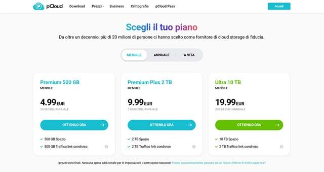 In alternativa ai piani a vita, pCloud propone soluzioni di abbonamento annuali a partire da 49,99 euro per uno spazio di archiviazione da 500GB. Di seguito i prezzi.
