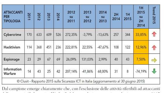 L’edizione di settembre 2015 del Rapporto CLUSIT fa prima di tutto una disamina dei più gravi attacchi registrati, a livello internazionale, nel biennio 2014-2015, casi clamorosi come la breccia subita dal colosso bancario JPMorgan , gli attacchi alle grandi catene distributive statunitensi (Target, Home Depot), lo spionaggio industriale ai danni del Gruppo Benetton e la compromissione gravida di conseguenze dei server di Sony Pictures. Prendendo in considerazione la prima metà del 2015, il rapporto CLUSIT evidenzia una crescita sostenuta (a livello mondiale) della tipologia di attacchi classificabile come “cyber-crimine”, che registra un “salutare” +33,85 per cento e rappresenta il 66 per cento totale degli attacchi. In seconda posizione ci sono i casi di hacktivismo (+12,96 per cento), mentre il trend di crescita dello spionaggio è stabile (+7,50 per cento) e l'”information warfare” scende del -74,19 per cento.
