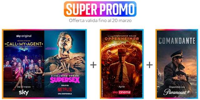 Segnaliamo l’offerta di Sky che include un mondo di intrattenimento a un prezzo davvero contenuto: ci sono Sky TV con tutti i suoi show e le sue serie, i contenuti di Netflix, i film di Sky Cinema e la piattaforma Paramount+ dove è da poco arrivato Comandante. Tutto questo a soli 19,90 euro al mese invece di 44,00 euro, per 18 mesi. Attenzione: la super promo scade il 20 marzo.