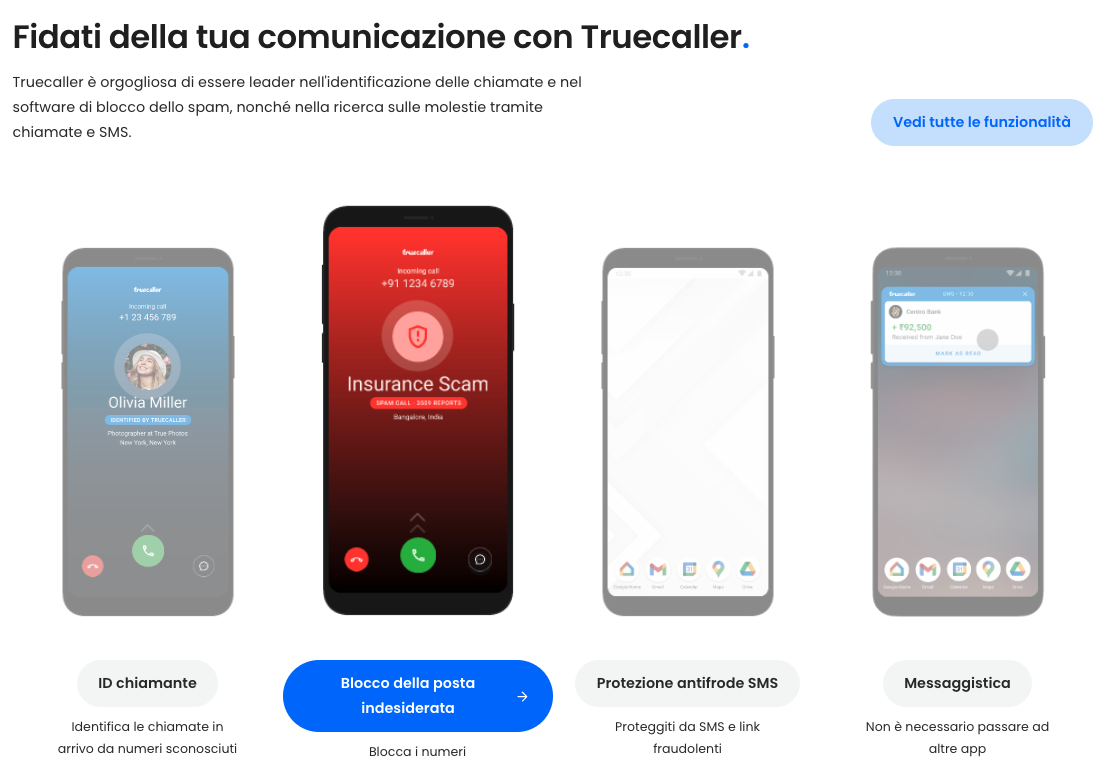 Truecaller è un’app per smartphone Android e per iPhone in grado di riconoscere le chiamate in ingresso e segnalare quelle spam all’utente prima che risponda. Questo filtro per le chiamate agisce come un nuovo dialer (compositore telefonico) e interfacciandosi con database online costantemente aggiornati. Truecaller può anche silenziare del tutto le telefonate indesiderate, così da non essere disturbati durante le riunioni o durante le ore di relax.