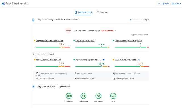 Per ottenere dati certi, o meglio quelli che vengono presi in considerazione da Google per la metrica dei Core Web Vitals, è sufficiente usare Google PageSpeed Insight.