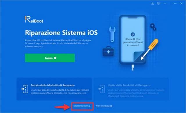 - 1.2 Utilizzando il cavo originale Lightning, collega al computer l’iPhone che non si avvia. Procedi cliccando su [Reset Dispositivo] per avviare ripristino iPhone senza iTunes.
