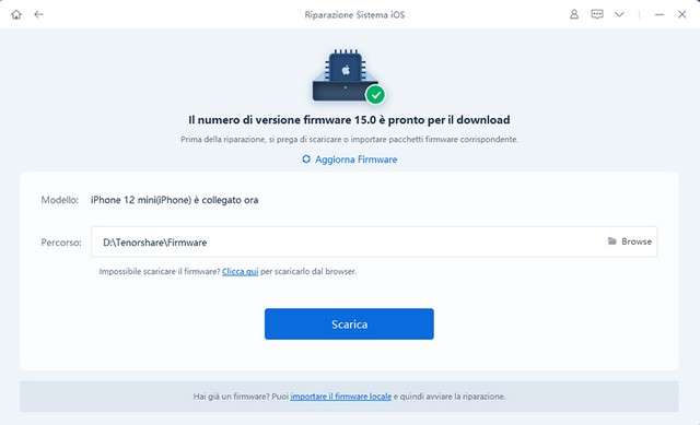 - 1.4 Ora per procedere al reset, è necessario scaricare o importare l’ultimo pacchetto firmware disponibile. Quindi, clicca su [Scarica] per avviare il download. Se hai già scaricato il firmware iOS, potrai importarlo manualmente.