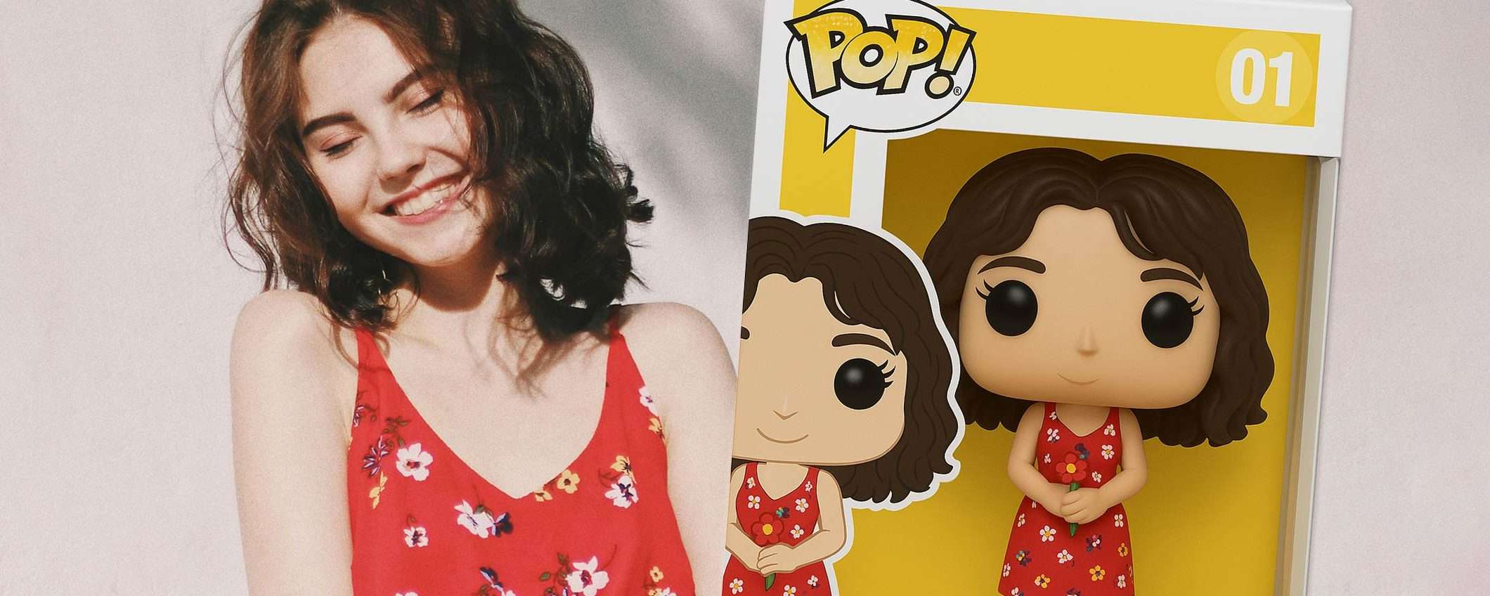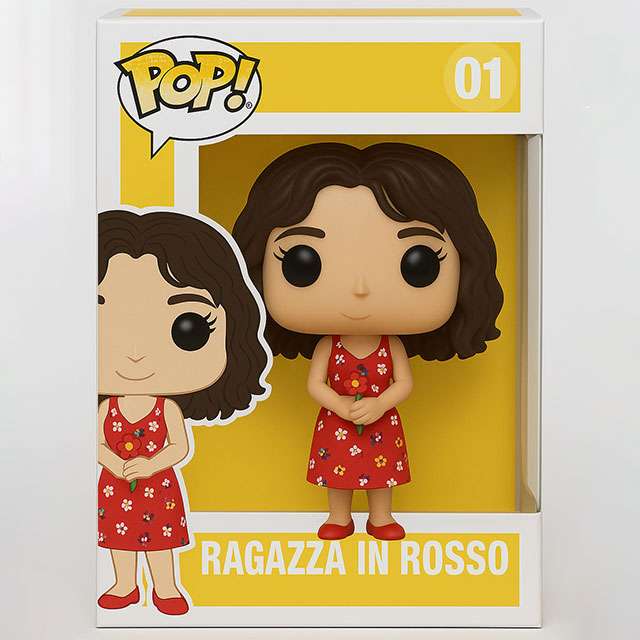 Trasformami in un personaggio Funko Pop esattamente come quello del riferimento. Devo essere nella scatola con UN FIORE IN MANO. Mi chiamo RAGAZZA IN ROSSO. Il colore principale del box è il GIALLO.