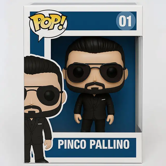 Trasformami in un personaggio Funko Pop esattamente come quello del riferimento. Devo essere nella scatola. Mi chiamo PINCO PALLINO. Il colore principale del box è il BLU.