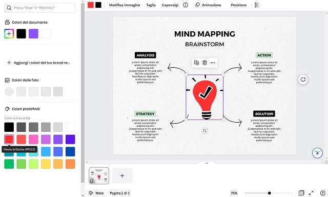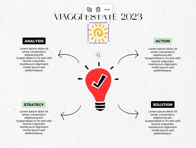- Un’altra importante modifica che Canva consente di effettuare gratuitamente durante il processo di creazione di una mappa mentale è l’aggiunta di elementi visivi, immagini, grafici, ecc. Poniamo il caso di voler sostituire il sottotitolo “Brainstorm” con un sole, in modo da richiamare il focus centrale della mappa. Per farlo, occorre innanzitutto cliccare sul sottotitolo (in questo caso appunto “Brainstorm”) e pigiare sull’icona del cestino che compare in automatico in corrispondenza del riquadro.