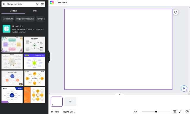 - Selezionare sotto il tab Modelli uno dei template con cui si preferisce creare la propria mappa mentale. In base al progetto a cui ci si sta dedicando, può essere utile usare la ricerca interna a Canva digitando il colore o il tema che si pensa possa esaltare ancor di più le proprie idee.