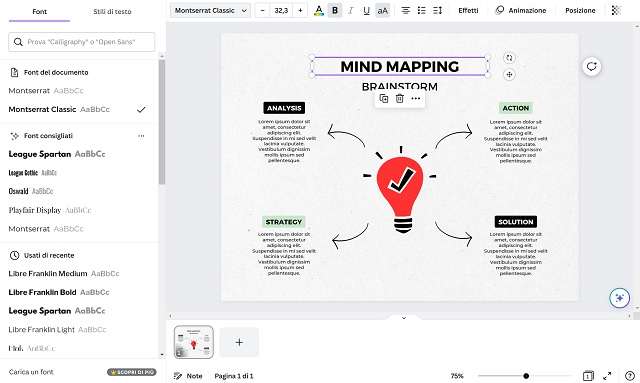 - Si può poi modificare il font impiegato dal modello predefinito di Canva, scegliendone uno tra i tanti disponibili nell’elenco dei font gratuiti della piattaforma. Se ad esempio si vuole modificare il carattere del titolo, in questo caso si clicca su “Mind Mapping” in alto al centro (il titolo del template predefinito), quindi si seleziona la freccia giù del riquadro del font in alto a sinistra e si seleziona uno dei propri caratteri preferiti. Nella prima sezione compaiono i font già presenti nel modello in uso, appena sotto invece c’è la sezione dei Font consigliati in automatico da Canva, quindi quelli usati di recenti e quelli popolari, cioè i font più utilizzati dagli altri utenti di Canva.