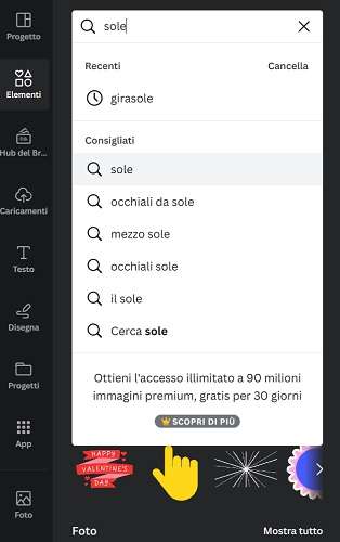 - Il passaggio successivo consiste nel selezionare il menu Elementi dalla colonna di sinistra e digitare nel campo di ricerca la parola “sole” o quella associata a qualsiasi altro elemento si voglia inserire nella mappa mentale. Dopodiché basta premere sul risultato corrispondente per avviare la ricerca.