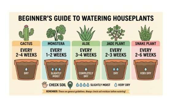 Il prompt: Crea un’infografica per principianti che mostri ogni quanto annaffiare cactus, monstera, aloe, giada e sansevieria, con illustrazioni del terreno che indicano il livello di umidità ideale per ciascuna pianta. Aggiungi icone intuitive di umidità.