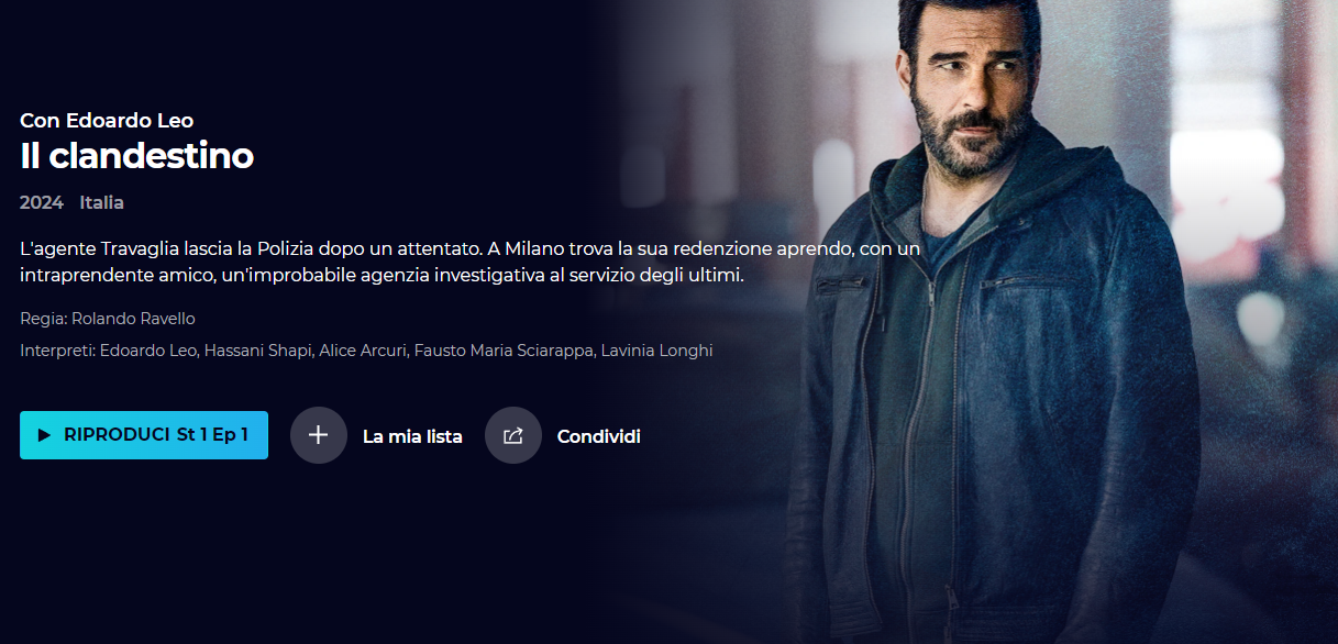 Il Clandestino è la nuova fiction di Rai 1 con protagonista Edoardo Leo. La serie è composta da 12 puntate. La Rai trasmetterà ogni lunedì due puntate in diretta TV e streaming. Tutta la serie sarà visibile anche on demand, grazie a Rai Play, in modo completamente gratuito.