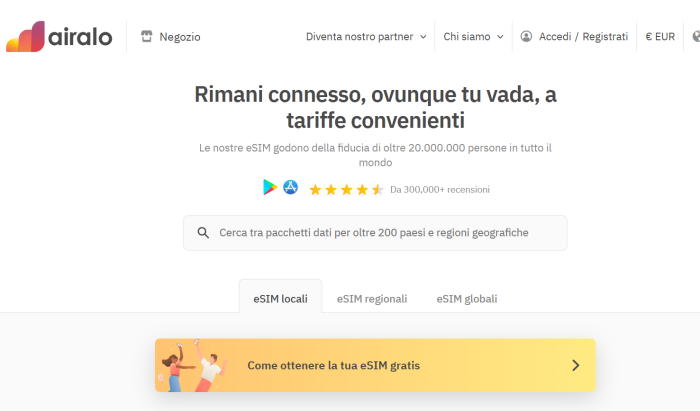 Se il tuo smartphone è compatibile con la tecnologia eSIM, Airalo rappresenta una delle soluzioni più intelligenti per restare online ovunque. E in questo momento è ancora più interessante: i nuovi utenti ricevono 1 GB di dati gratuiti validi per 24 ore in oltre 200 destinazioni nel mondo. Basta registrarsi sul sito ufficiale per attivare la eSIM di benvenuto gratuita in pochi minuti.