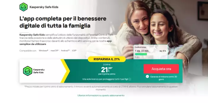 L’offerta attuale rende ancora più accessibile questo strumento indispensabile, visto che è possibile risparmiare il 21% sul piano annuale. Non perdere l’occasione di proteggere la tua famiglia e di garantire ai tuoi figli una navigazione sicura. Attiva Kaspersky Safe Kids oggi e approfitta di un prezzo speciale per un anno di protezione completa.
