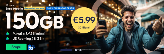 Ogni mese la tua bolletta ti guarda storto e tu ricambi con il broncio? Con Lyca Mobile, dire addio alle tariffe esagerate è più facile che mai, e oggi ti costa davvero pochissimo. 150GB di internet, chiamate e SMS illimitati, più 8GB di roaming UE a 5,99€ al mese. E come se non bastasse: i primi 2 mesi te li regala Lyca. Sì, proprio gratis. Nessun trucco, nessuna clausola scritta in piccolo.