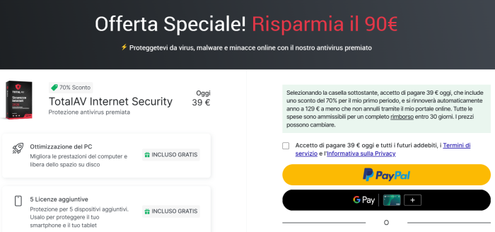 Con la versione Total Security mette a disposizione una licenza annuale scontata a soli 39 euro, pari a una riduzione dell’80% rispetto al prezzo standard. Detto questo, vediamo più nel dettaglio quali sono le funzionalità di TotalAV.
