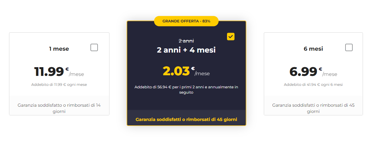 La promozione attuale consente l’attivazione di CyberGhost con un costo di 2,03 euro al mese. L’offerta è legata all’attivazione del piano biennale con 4 mesi extra che prevede fatturazione anticipata (con una spesa totale di circa 57 euro e possibilità di pagare in 3 rate con PayPal). Per accedere subito alla promozione basta seguire il link qui di sotto.