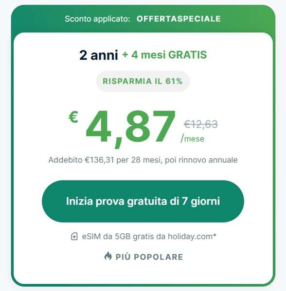 Tornando all’offerta di ExpressVPN, segnaliamo che la promozione in corso include oltre al 61% di sconto anche una eSIM da 5GB gratis del servizio holiday.com, lo strumento ideale per avere Internet quando ci si trova fuori dall’Unione europea.