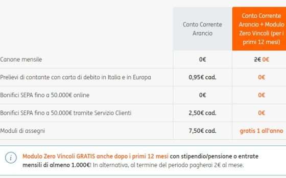 Anche dopo i primi dodici mesi, è possibile continuare ad azzerare i costi delle operazioni bancarie attivando l’opzione “Modulo Zero Vincoli”. Questa opzione, permette di azzerare i costi legati alle operazioni e anche i costi di tenuta conto accreditando lo stipendio o la pensione su Conto Corrente Arancio oppure con entrate di almeno 1.000€ al mese.