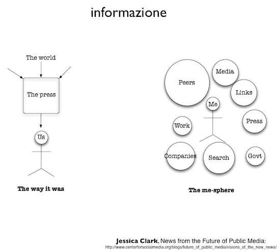 Siamo abituati a dare a questo cambiamento un valore positivo: le fonti informative si moltiplicano, dove un tempo c’erano solo radio, TV quotidiani e magazine ora c’è un pulviscolo disomogeneo costituito dai media ma anche da siti web, blog, social network e mille altre fonti. Con l’aumentare del numero di informazioni che possiamo padroneggiare aumenta anche la nostra capacità di essere informati, e diventano fondamentali alcune pratiche di filtro editoriale che consentano di navigare dentro un numero così grande di informazioni.