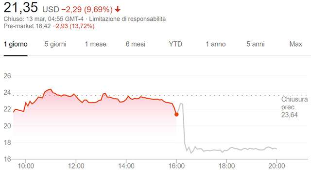 La tendenza ha comunque interessato tutte le borse e gli indici a livello globale. Quella di ieri è stata una giornata nera per l’economia a ogni livello, anche per le sue manifestazioni meno convenzionali: in picchiata persino Bitcoin e molte altre criptovalute. Tornando a Slack, di seguito il grafico che mostra l’andamento del titolo nelle ultime 24 ore.
